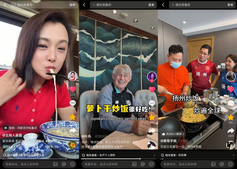 借助赛事热度,江苏省各地非遗美食“家底”也被轮番曝光。@主持人梁晶 在泰州观赛时,发布美食视频称赞“在泰州叫醒我的不是闹钟,而是泰州的早茶”,获数万点赞;前国足国家队主教练米卢现身常州队比赛观众席,并用中文大赞“萝卜干炒饭”好吃,向网友种草;江苏本地达人@叨叨傅 辗转多城观赛,品尝镇江锅盖面,学做扬州炒饭,吃遍各地美食。数据显示,5月10日至9月15日,抖音江苏非遗餐饮相关团购订单同比增长49%,销售额同比增长209%。