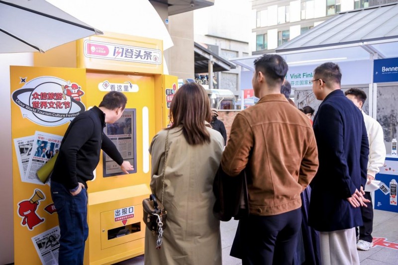 特别设置的“闪境漫游护照集章”活动引发了游客的极大参与热情,通过兑换“世界币”,游客们完成知识问答、游戏挑战,收集专属印章兑换精美礼品。“闪现全球对话门”前,游客们与屏幕另一端的参与者实时互动,体验跨越时空的交流乐趣。“闪登头条拍报机”区域更是排起长队,游客们争相记录下“登上头条”的难忘时刻。