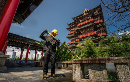 “落霞与孤鹜齐飞,秋水共长天一色”的壮阔美景,让滕王阁每年吸引超1200万游客慕名探访。然而,长期暴露于自然环境中,建筑表面早已积满苔藓等生物污垢,雨水冲刷形成的沉积污渍、石材反碱等问题愈发凸显。如何在高效清洁的同时保护古迹本体,成为亟待破解的难题。基于此,德国卡赫时隔4年再度来到江西南昌,以更精细、更具针对性的解决方案,为滕王阁带来一场“温柔而彻底”的深度清洗。