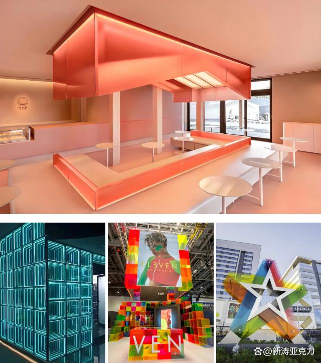无限色彩库:描绘品牌个性底色。新涛亚克力提供丰富的“色彩库”与色彩解决方案,同时具备极强的可塑性。从渐变色调到高饱和色块,从柔和的哑光质感至璀璨的高光效果,它能完美承载品牌理念,为设计师提供近乎无限的创意挥洒空间。