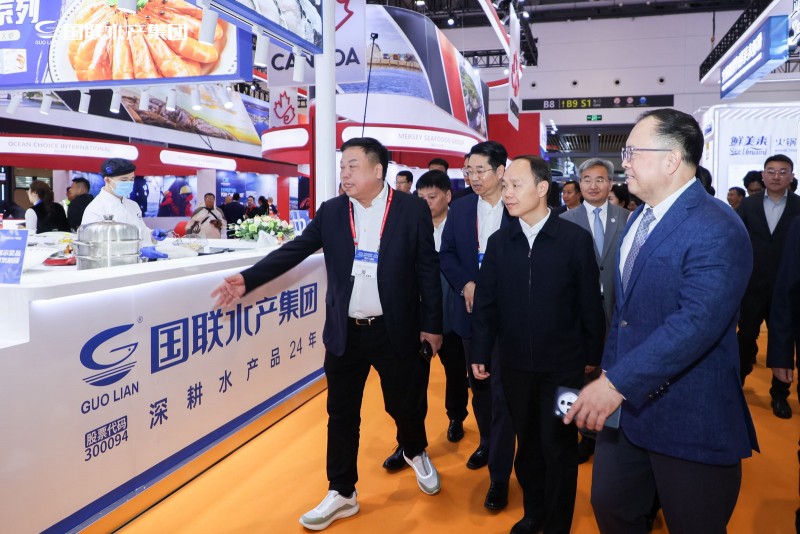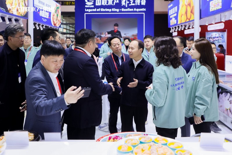 展会首日,农业农村部党组成员、副部长、直属机关党委书记张治礼亲临国联水产展位巡视指导。国联水产董事陈汉陪同参观,并详细介绍了公司最新研发的虾类产品及预制菜系列。