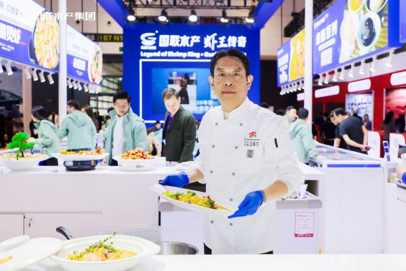 国联水产特邀中国资深烹饪大师、国际外交活动主厨王海东亲临现场,以国联明星产品——龙霸煲虾、汉虾为食材,现场演绎多款创意菜品。王海东大师的精湛技艺与国联产品的高品质相得益彰,成为展会一大亮点。