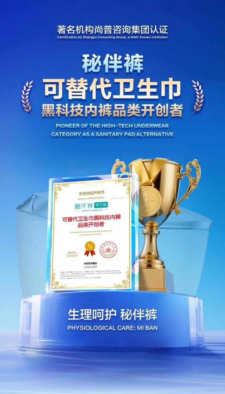 2025年8月,尚普咨询集团对可替代卫生巾黑科技内裤市场开展了专项研究,从行业趋势、竞争格局、企业产品等方面针对行业进行了全面、系统、深入的调研,以呈现秘伴裤在行业中的市场地位。此次,秘伴裤荣获尚普咨询集团颁发的“可替代卫生巾黑科技内裤品类开创者”市场地位声明,这不仅凸显了秘伴裤的实力与市场影响力,更标志着其在可替代卫生巾黑科技内裤领域的领先地位,为可替代卫生巾黑科技内裤行业高质量发展树立了标杆。