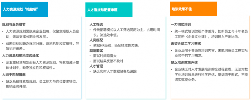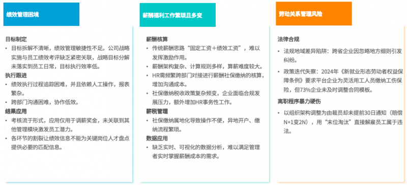 在企业人力资源管理领域,当下存在诸多亟待解决的痛点。人力资源规划与业务脱节,人岗匹配度低;人才选拔配置依赖人工,效率与精准度不足;培训忽视差异、效果难评估;绩效管理目标分解、执行及应用均有欠缺;薪酬福利核算繁琐、数据应用弱;劳动关系管理存在法律与流程风险。这些痛点综合起来,对企业人力资源管理的效率与效能提升形成了制约。