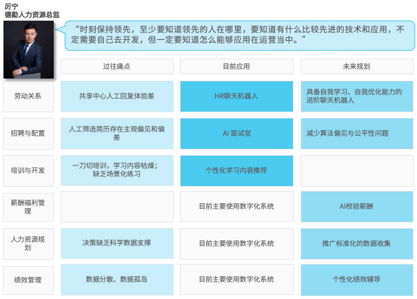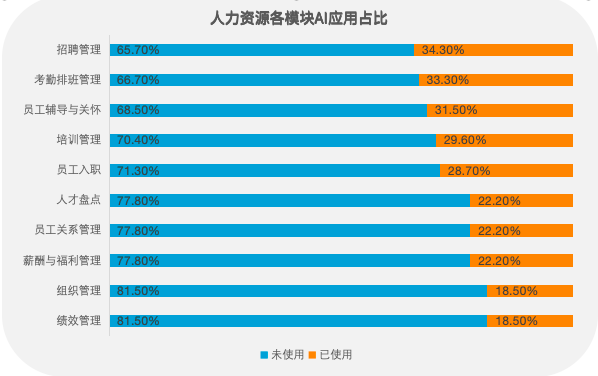 招聘模块渗透率最高,主要是因为招聘依赖结构化的简历数据,数据公开且易获取,AI可轻松完成简历初筛等工作。相比之下,绩效薪酬和组织发展等模块的数据敏感度高。同时,绩效评估是多维的行为数据,采集难度高。 要提高薪酬、绩效等模块的渗透率,最重要的是需要实现数据的结构化存储,建立统一的标准,可以由协会、第三方机构或国家出台指导标准,企业在此基础上结合自身管理方法论进行调整。