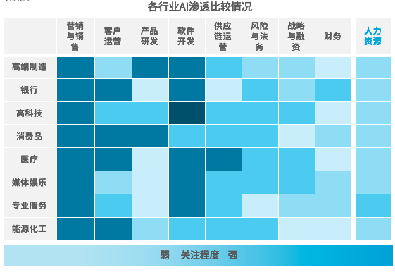 在数字化转型浪潮下,AI已深度渗透各行业,但不同领域的AI应用进程存在明显差异。在高端制造、银行、高科技等多个行业里,营销与销售、产品研发、软件开等领域的AI渗透普遍更高,人力资源领域相对滞后,这主要是由于: