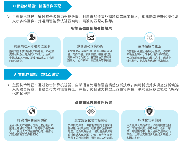 AI智能体通过多类智能应用破解这些难题:借助大模型和自身能力解析岗位JD与简历语义,实现智能画像匹配,提升人岗匹配精准度;以多模态分析候选者微表情、语音特征,充当虚拟面试官,增强面试效度并减少人为偏见,全方位驱动招聘与配置流程的智能化升级。
