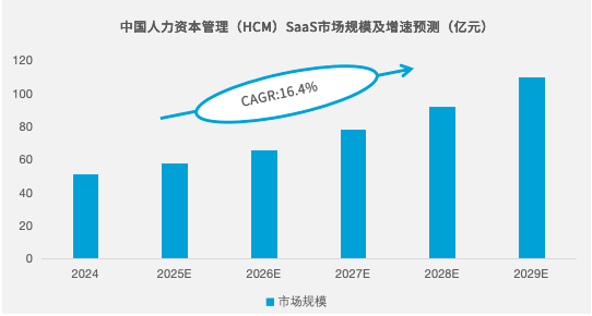 IDC最新报告显示,2024年中国HCM SaaS市场规模达51亿元,同比增长12.4%,预计2029年将突破110亿元,年复合增长率超16.4%。在此进程中,AI技术将成为行业升级的核心驱动力,头部厂商将凭借 “夯实AI” 战略来持续加强市场的竞争力。