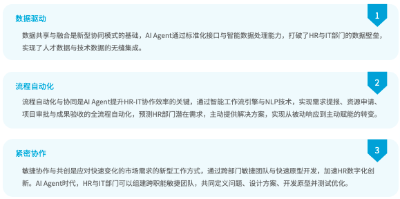 AI Agent的普及将推动企业组织形态向更扁平化、网络化与敏捷化的方向演进,人力资源部门与IT部门的协同模式也将随之变革。AI Agent技术催生的人力资源与IT部门新型协同模式,其核心特征是数据驱动、流程自动化与紧密协作。