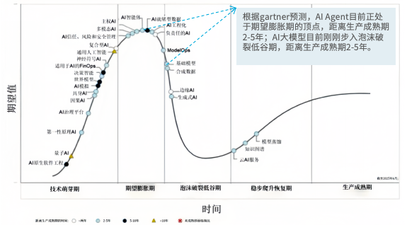 相比视觉识别、语音识别、OCR等技术已经展现出高度成熟度,实现了规模化、稳定化的商业应用,根据Gartner技术成熟度曲线预测,AI大模型刚刚步入泡沫破裂的低谷期,预计未来2-5年进入生产成熟期;而AI Agent目前正处于期望膨胀期的顶点,同样需要2-5年才能成熟。