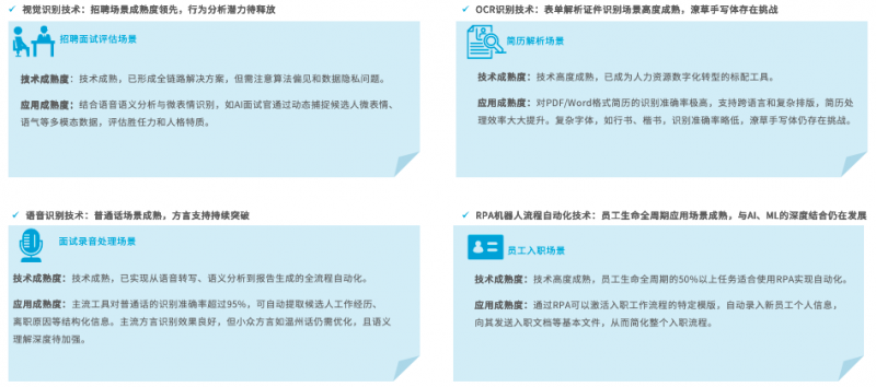 人力资源行业的AI技术应用已从单点工具升级为全链路解决方案,其中视觉识别在招聘场景中、语音识别在面试录音场景中、OCR 在简历识别场景中、RPA在全流程自动化场景中均展现出高度成熟度。