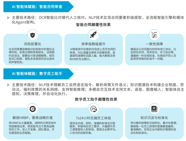 AI智能体通过多类智能应用发挥关键价值:在智能合同管理上,借助OCR、NLP等技术审阅法律条款,精准识别用工协议风险点,实现风险前置、效率提升与标准统一;数字员工助手,依托NLP、知识图谱等技术,高效响应员工常规咨询,大幅减轻HRBP事务性工作压力,使其能聚焦更具战略价值的工作,全方位助力企业优化劳动关系管理,提升组织效能。