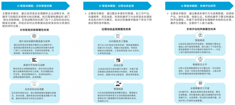 在绩效管理领域,AI智能体可构建反馈闭环。目标智能拆解能精准对齐战略且支持动态调整;过程动态监测整合多源实时数据,实现实时评估、自动记录并助力管理赋能;多维评估矩阵集成多类数据,构建模型生成量化全面个人能力画像,让评估智能高效、数据民主公平,全面衡量员工价值。