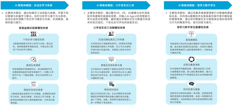 在企业培训与开发中,AI智能体提供个性化助力。自适应学习系统定制学习路径、生成课程并评估效果;元宇宙实训工场借VR等技术打造沉浸式场景,增强互动还降本;领导力数字孪生通过数据与AI建模,模拟管理场景助力领导力提升,推动企业培训变革。