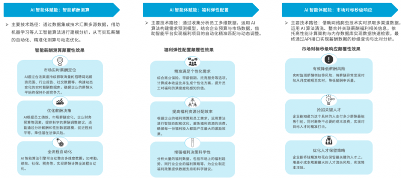 在企业薪酬福利管理中,AI智能体作用显著。智能薪酬测算整合多源数据,借算法实现测算自动化、精准化与动态优化;福利弹性配置分析员工数据,构建模型精准匹配福利,提升分配效率与决策科学性;市场对标秒级响应靠数据抓取和算法,快速检索比对薪酬数据,降低薪酬风险、助力抢才与优化人才保留,推动管理智能化升级。