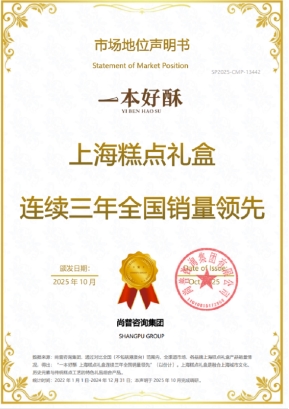 2025年10月,尚普咨询集团对上海糕点礼盒市场开展了专项研究,从行业趋势、竞争格局、企业经营等方面针对行业进行了全面、系统、深入的调研,以呈现一本好酥在行业中的市场地位。此次,一本好酥荣获尚普咨询集团颁发的“一本好酥 上海糕点礼盒连续三年全国销量第一”市场地位声明,这不仅凸显了一本好酥的产品创新与市场影响力,更标志着其在上海糕点礼盒领域的领先地位,为上海糕点礼盒行业高质量发展树立了标杆。