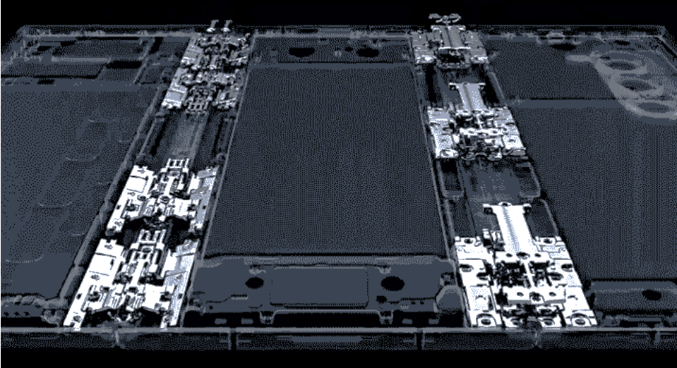 面对三重折叠形态下不同面板重量与内部布局的复杂挑战,该铰链采用两组不同尺寸的双轨结构协同运作,实现了流畅稳定的内折叠体验。钛金属铰链盖与超薄金属防护层的结合,在提升耐磨性的同时保护内部精密结构。这一设计不仅增强了机械可靠性,更使屏幕闭合时贴合紧密,折叠间隙显著缩小,为机身实现折叠后厚度12.9毫米,展开后最薄处仅3.9毫米(带SIM卡托盘的屏幕)的超薄形态奠定基础。