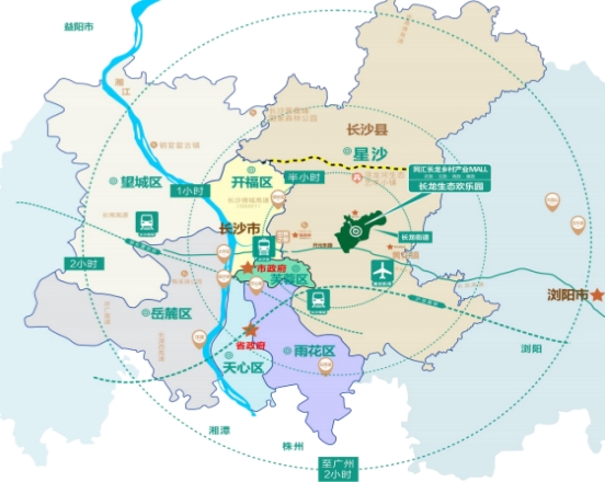 项目规划总面积约2680亩,森林覆盖率达45%,负氧离子浓度高,水系面积360亩,形成高质量的近郊“天然氧吧”。园区区位优势明显,距黄花机场约10.7公里、长沙南站17.9公里,交通十分便捷。
