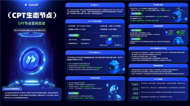 根据 CoinP 币朋官方公布的信息,CPT 挖矿启动后,平台将每日固定释放 92,400 枚 CPT,其中 80% 即 73,920 枚将用于节点用户挖矿产出,其余 20% 用于基金会及生态合伙人的激励分配,从机制上兼顾节点收益与生态长期建设。同时,CoinP 还确认,CPT 将于 12 月 18 日正式上线 CoinP 现货交易区,挖矿产出的 CPT 可第一时间进入流通市场,实现“挖矿—交易—价值转化”的完整闭环。这一节奏安排也被视为 CoinP 为 CPT 长期价值稳定性所做的系统性规划。