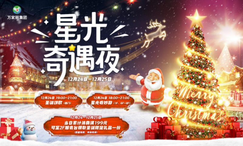 12 月 24 日平安夜,万家丽延长营业时间至 23:00,用 “圣诞奇妙夜” 主题活动拉开节日序幕。1F 西门的限定音乐表演将准时登场,灵动旋律为平安夜注入浪漫氛围,让市民游客在音符中感受节日温馨。消费福利同步上线,12 月 24 日至 25 日期间,场内当日消费满 199 元即可前往 2F 服务台领取圣诞限量宝藏礼袋;国际美妆区消费满 499 元更可加赠专属限量圣诞礼,双重惊喜为节日购物增添仪式感,让每一份消费都收获满满诚意。