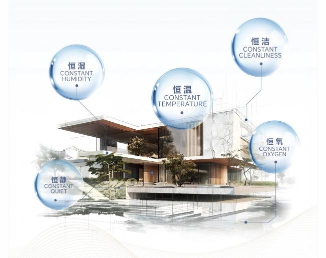 对于每个项目,罗浮荟·曜悦都会配备强大的五恒系统(恒温、恒氧、恒湿、恒净、恒静),让业主在家也能享受森林氧吧般的清新空气。