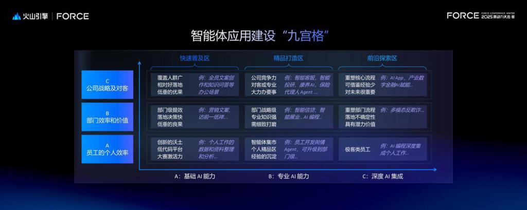刘俊强调,市场对智能体的期待已超越单纯技术展示,聚焦于普及广度、价值高度和技术深度三大核心维度。基于对行业核心需求与技术发展趋势的洞察,火山引擎创新推出了智能体应用建设九宫格模型,为金融机构不同阶段、不同维度的智能体建设需求,提供精准的应用指引。该模型按照智能体的不同应用场景、不同发展阶段划分了梯度化落地路径。无论是 AI 应用的不同阶段(基础 AI 能力、专业 AI 能力、深度 AI 集成),还是企业应用的不同需求维度(个人效率提升、部门协同提效、公司战略和对客价值升级),这套模型都能精准匹配适配的 AI 落地方案,助力科学布局与高效落地。