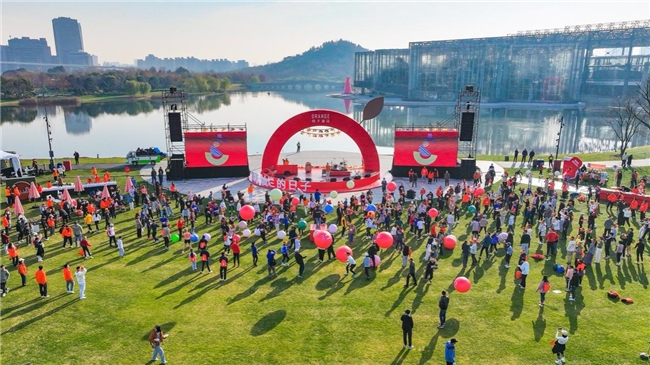 早上9点,世博文化公园的宁静,被四处迸发的多巴胺球、音乐和跑者们的呼喊所打破。超1000名桔子粉丝,踏上5公里的追日跑。一群群人穿梭于疏朗的林木与开阔的草坪之间,像一场把自己扔进阳光和风里的冒险。多巴胺和内啡肽悄然组队上线,唰地一下,积压的疲惫与焦虑跟着汗水一起蒸发,身心在奔跑中逐渐加满“热情”。