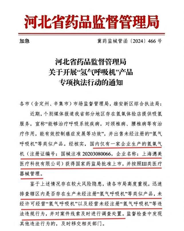 钟南山院士强调,氢氧吸入需使用国家药监局批准的三类医疗器械,避免工业氢气带来的安全风险。对于市场上涌现的大量无证非法宣传的山寨设备,各地药监局将予以处置: