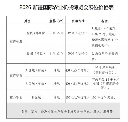 2026新疆国际农业机械博览会(以下简称“博览会”)定于2026年5月25—27日在新疆国际会展中心(新疆乌鲁木齐市水磨沟区红光山路3号)举办,展位申报已启动,可登录网址:www.camf.com.cn,完成参展手续办理。