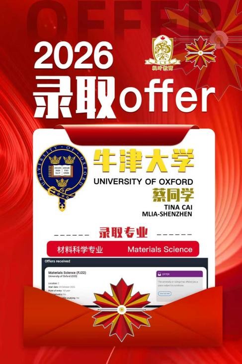 1月13日,枫叶世界学校课程2026届毕业生传来重磅喜讯——深圳校区准毕业生蔡同学正式收到牛津大学材料科学专业的录取通知。这是全球顶尖学术殿堂对枫叶学子学术潜力的极高认可,更是枫叶世界学校课程学术质量与权威性的有力印证。