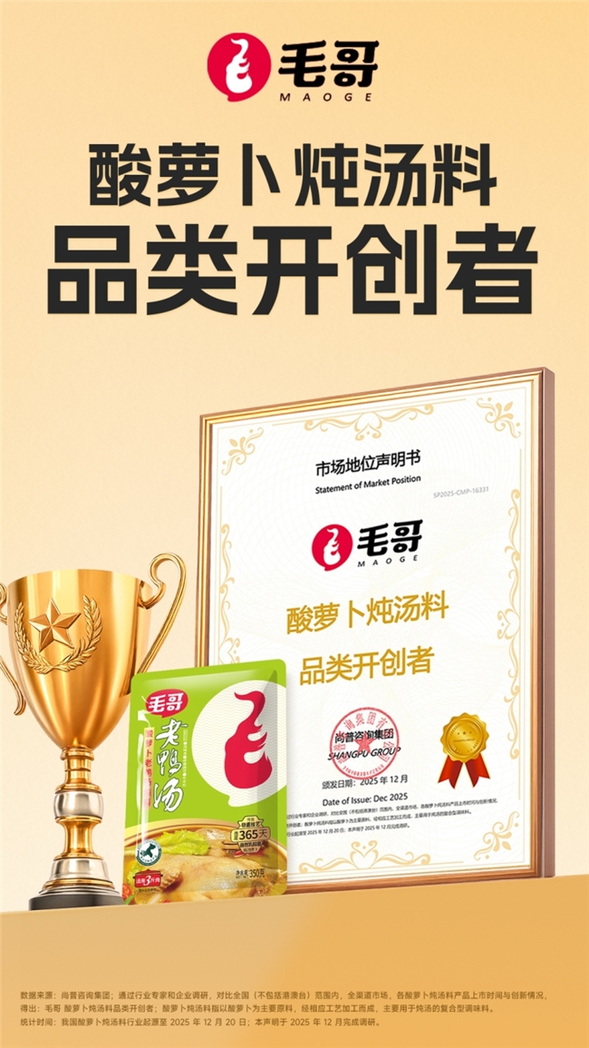 2025年12月,尚普咨询集团向毛哥颁发市场地位声明书。毛哥荣获【毛哥 酸萝卜炖汤料品类开创者】市场地位声明,标志着其在调味品行业的标杆地位及市场的高度认可。