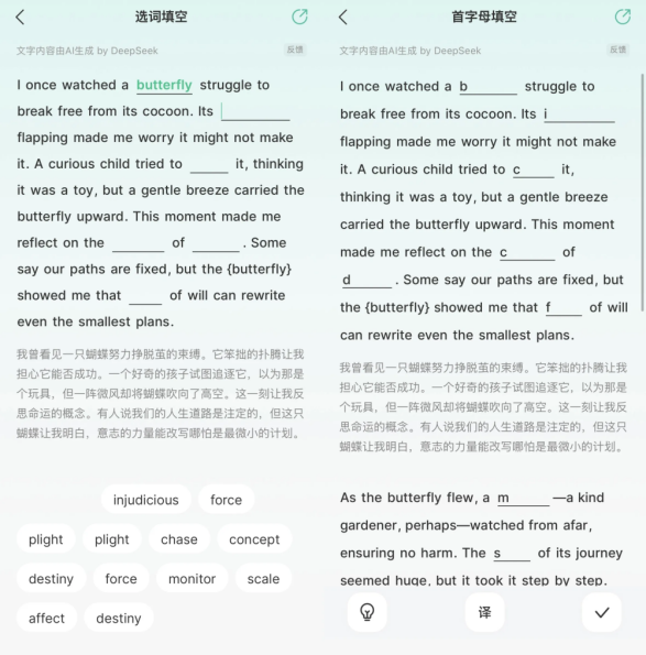 通过【短文填词】的反复练习,你将那些被动记录在生词本里的单词,真正转化为了能够主动调用的“得分利器”,从而构建起一个“发现弱点 → 记录弱点 → 攻克弱点”的完美学习闭环。