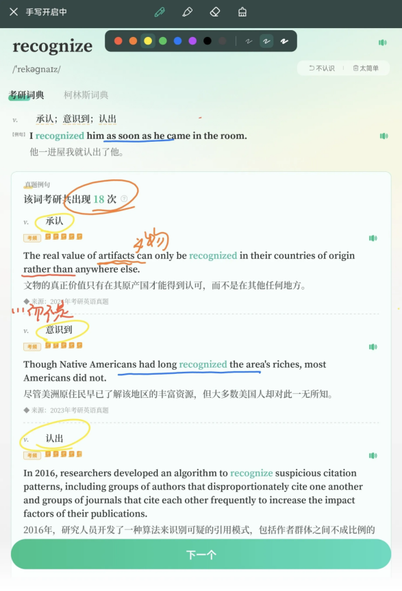 1. 在真题语境中,像出题人一样理解词义。 背单词时绝不能再满足于只看中文释义,建议去精读我们为每个核心单词配备的【真题例句】。而扇贝单词最智能的地方,在于直接为你划好了重点:单词的【核心考义】会被标注,同时还会标注出该词的【考频】。这些数据明确地告诉你,这个词在考研中更倾向于考察哪个意思,让你在记忆时能立刻分清主次。