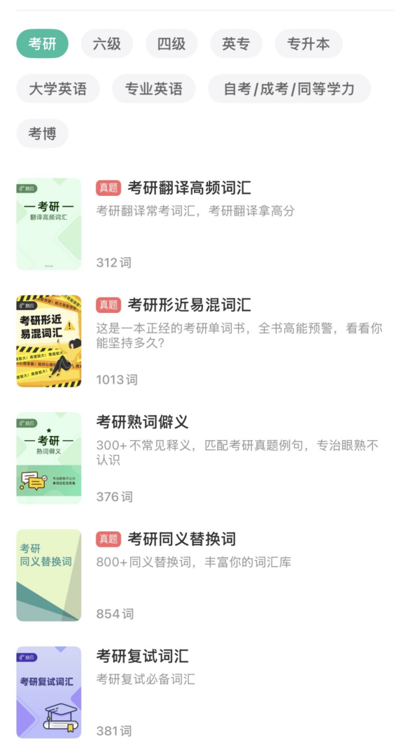1.你需要锁定一本贯穿全程的词书。扇贝单词App在这一点上为你提供了堪称“军火库”级别的选择,让你能轻松找到与你学习体系完美匹配的词书。我们提供全面的考研词书库,涵盖考研大纲词、真题高频词、主流实体书配套词表、形近易混词等,并已全部更新至27版本。你需要的,这里都有。无论你处于哪个备考阶段,都能在这里找到最适合、最新的词书资源,无需在不同应用间切换寻找。