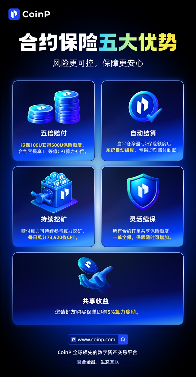 日前,在加密货币市场合约交易波动性高、专业性强、潜在损失风险大的背景下,聚合交易平台CoinP币朋重磅推出合约保险这一创新保障服务,不仅为全球机构及交易者提供高倍率减损保障,更以CPT为核心纽带,通过全商业场景赋能开启价值增长新周期。本文将深度解析合约保险的核心机制与价值,带您全面了解CoinP币朋生态的创新布局。