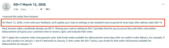 根据亚马逊官方公告,自 2026 年 3 月 12 日起,平台将全面升级资金管理系统。核心逻辑即为“DD+7”:卖家发货后,货款将先行进入“延迟交易”账户。只有在物流信息显示妥投(Delivery Date)后,资金才会转入储备金,并在此基础上额外强制保留 7 天。