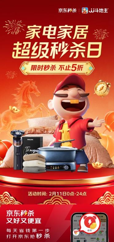2月11日京东“家电家居超级秒杀日”,爆款直降、好礼纷呈,更有覆盖城乡的便捷物流服务保障,是入手品质年货的绝佳机会。快打开京东APP,进入“秒杀”频道,锁定心仪好物,以超值价格开启马年崭新生活!