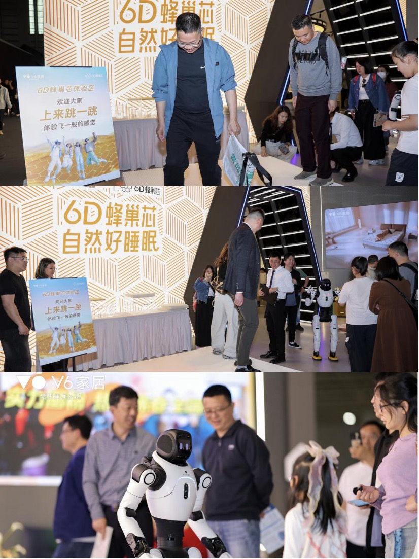 作为慕思集团年轻品牌,本次展会,V6家居通过还远真实睡眠场景,搭建新品硬核测试以及展出多元产品矩阵等优势,在智能机器人的介绍和指引下,开展首日就迎来人流热潮,现场人头攒动、咨询不断。尤其是6D蜂巢芯、星空自感弹簧两大核心床垫系列,搭配床架、客餐厅家具等配套产品,凭借突出的科技实力、直观的舒适体验与套系化的家居解决方案,吸引大量参展人员驻足体验、深度试用,收获一致好评,充分彰显 V6 家居强劲的市场号召力与品牌影响力。