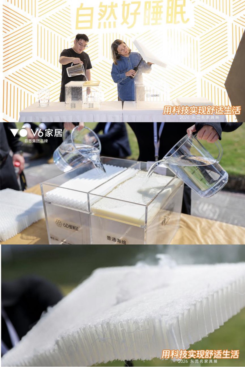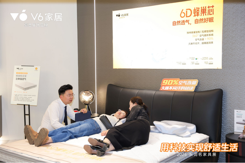 健康消费升级背景下,消费者对睡眠体验的需求愈发精细化,传统床垫闷汗、支撑不均、易塌陷等痛点亟待破解。作为年轻人的一站式家居解决方案提供者,V6家居敏锐察觉到消费者对“好睡感”的真需求,在本次东莞展重磅展出聚焦“国人经典硬睡感”的6D蜂巢芯系列床垫,通过材料原创创新与结构专利突破,直击睡眠痛点,重新定义健康舒适睡眠标准。
