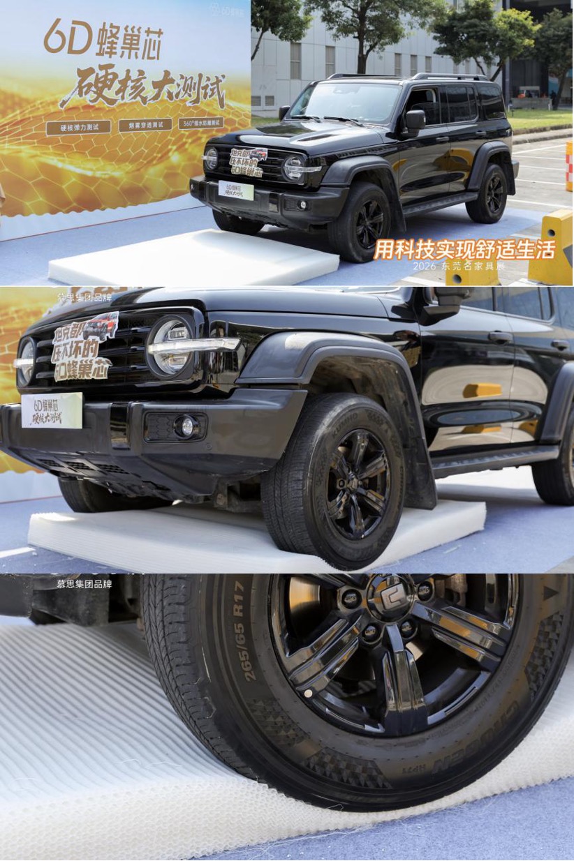 邀请现场观众随意试躺、翻滚、蹦跳,亲身体验床垫的支撑性与抗干扰性,有观众体验后表示:“躺上去能明显感觉到腰部、肩部支撑很到位,旁边的人蹦跳几乎没有晃动,睡感特别好。” 而坦克越野车碾压测试更是将现场氛围推向高潮,2吨重的坦克300驶上6D蜂巢芯床垫并反复碾压,床垫全程无塌边、无垮塌,碾压后迅速回弹至原状,其超强的结构稳定性与抗变形能力让现场观众惊叹不已。