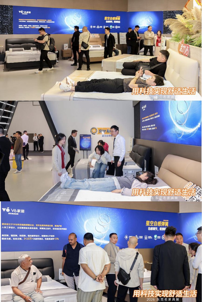 聚光东莞,潮启家居新章。3 月15日,以“聚光”为主题的第55届国际名家具展览会在东莞盛大启幕。作为开春家居行业首场重磅盛会,本届展会汇聚超1000家优质展商同台竞技,集中展现家居产业前沿发展趋势与核心创新成果。慕思集团品牌V6家居携6D蜂巢芯、星空自感弹簧两大核心系列寝具新品及多款创新家居产品惊艳亮相,以兼具颜值与硬核科技的产品矩阵,为参展客商、设计师及消费者带来沉浸式舒适家居体验,成为展会焦点品牌之一。