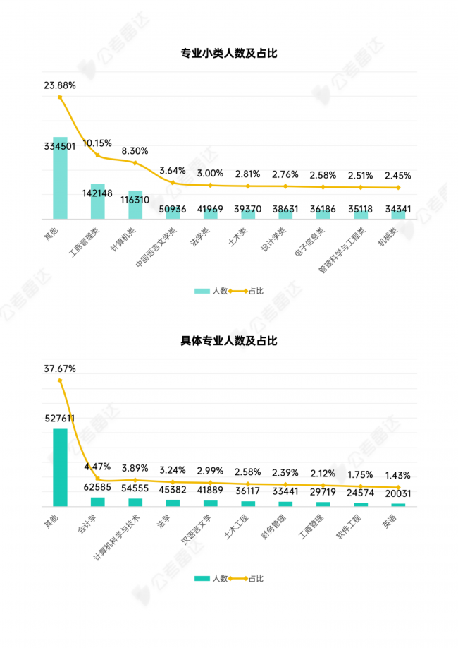 专业分布:具体专业方面,会计学、计算机科学与技术、法学等专业领跑,既符合国央企财务、技术、法务等核心岗位需求,也与公考热门专业高度重叠,进一步印证了“考公+国央企”双线备考的用户特征。
