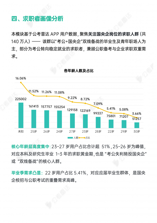 年龄分布:求职核心人群23-27岁占比超51%,即毕业1-3年的“考公转国央企”或“双线备战”主力军;同时22岁应届生占比5.41%,构成国央企校招与公考的重叠需求高峰。