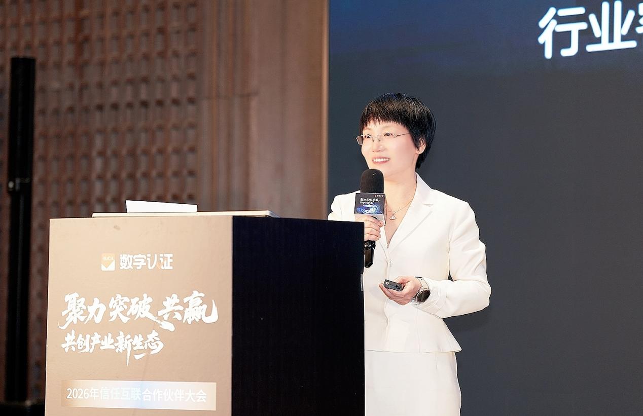 数字认证新闻发言人、总经理潘峰为合作伙伴全面梳理了数字认证这一年来的发展与突破。她表示,自从2025年9月公司并入北京数据集团,北京数据集团的强大动力和坚实保障让数字认证迎来发展新起点。她介绍到,在过去一年里,数字认证在国产密码前沿技术如内生密码、抗量子密码、隐私计算等领域都实现了创新突破,在智慧健康、企业数字化转型、智慧金融、政务等领域业务版图全面拓展。在2026年,数字认证将在行业市场深耕细作,借助AI、“数字健康”新基建、可信数据空间等风口,为全国数据要素流通领域的密码应用提供可复制、可推广的解决方案,与生态伙伴一道将“北京方案”推广至全国,共启数据安全新篇。