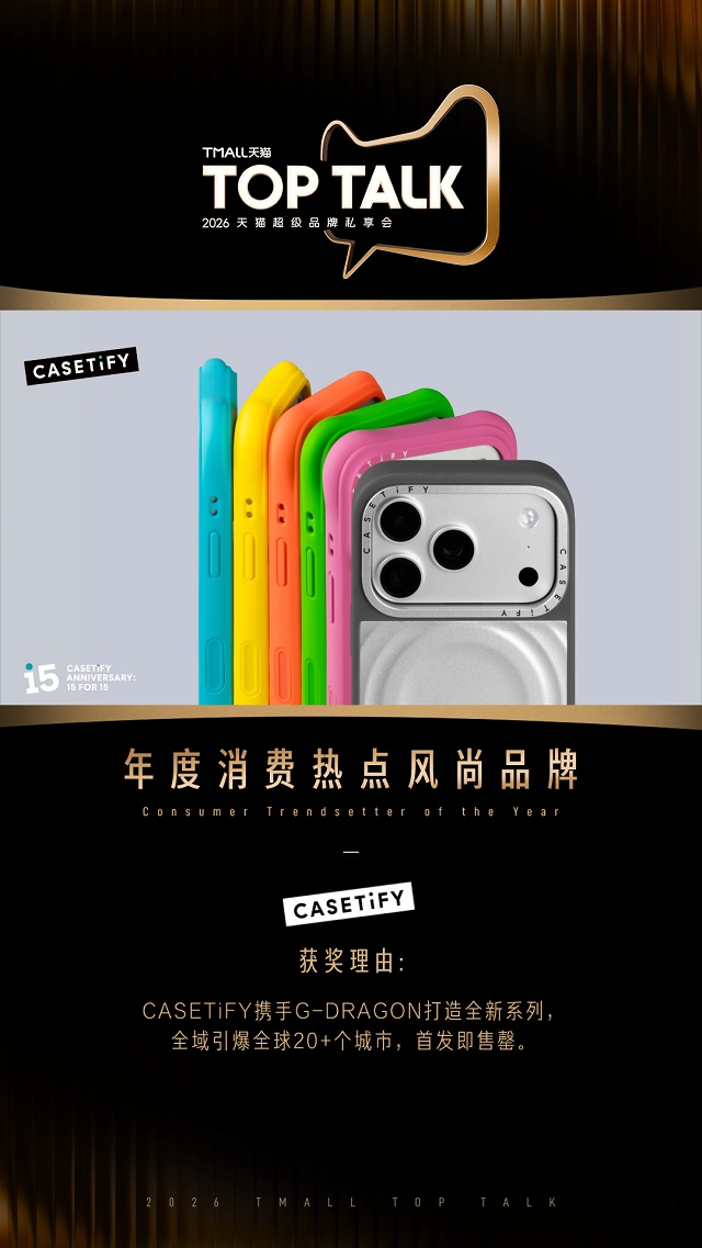 时代发展离不开“创新”一词,品牌发展亦是如此。而品牌发展的“创新”更要基于对消费趋势的洞察,针对日益多元的消费需求,能够提供更加个性化、多样化、品质化的产品与服务,是品牌增长的关键。潮流标杆品牌CASETiFY精准发掘当代年轻人通过手机壳等手机配件表达自我的需求,在品牌15周年之际官宣G-GRAGON为全球代言人,并通过天猫平台开屏、首页推荐等资源赋能,让情感共鸣被看见、被承接、被放大,同时通过搜索、人群触达与新品运营机制,将顶流影响力热度充分转化为站内购买力,实现7天站内曝光超2亿,品牌首日登顶3C数码配件店铺销量TOP1,斩获“年度消费热点风尚品牌”奖。