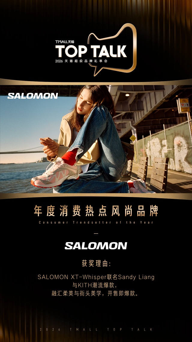 专业户外品牌SALOMON原本就在越野跑圈层拥有极高口碑,春节期间,演员孙千在春晚这一国民级流量舞台脚踩Salomon x Sandy Liang XT-Whisper联名款,成功将产品带入大众视野,制造“春晚同款”这一强大传播点,直接拉动了公众关注度。而后,SALOMON首次与天猫超级品牌日合作,在上海启动 GRABEL SHANGHAI 无固定路线挑战赛和沉浸式快闪体验,以激情与活力吸引了超40万人参与,XT-WHISPER星轨鞋开售即秒罄,首日登顶户外行业成交TOP1,成功将小众户外潮流推向大众视野,同样斩获“年度消费热点风尚品牌”奖,也再次印证了天猫潮流品牌爆款打造与破圈传播的核心能力。