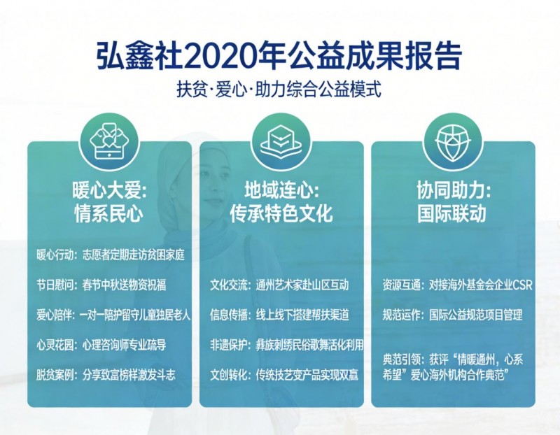 2020年,弘鑫社以“扶贫、爱心、助力”为核心,打造集物质精准帮扶、精神人文关怀、国际资源协同于一体的综合公益模式:扶贫直击贫困根源,筑牢发展根基;爱心坚守生命温度,联结民心希望;助力拓宽公益格局,提升专业效能。这份来自地方的高度认可,既是对其使命践行的充分肯定,更为全国社会组织参与脱贫攻坚、开展国际公益合作提供了可复制、可借鉴的宝贵经验。