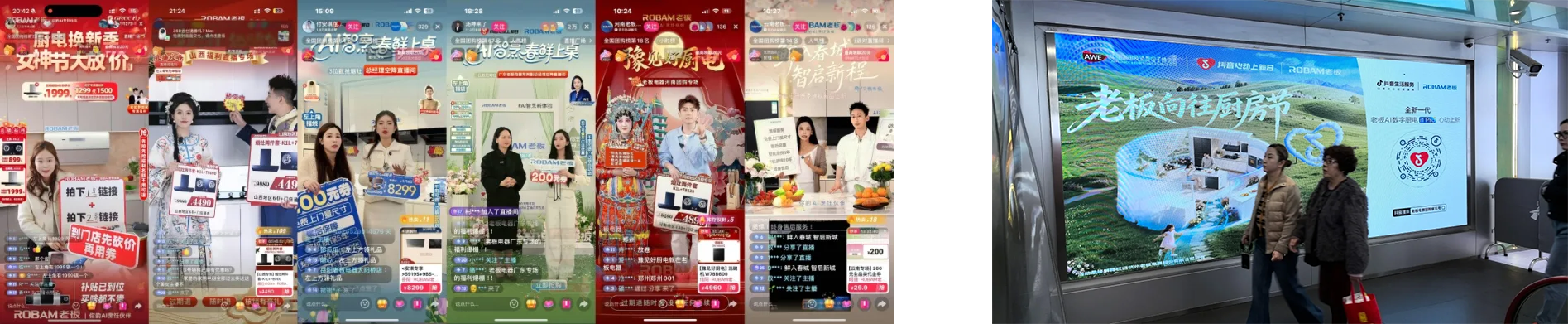 从首次看到 ROBAM 老板的开屏广告即被锁定,跟随「旷野感」的活动页面打开新品尝鲜欲;接着在 #老板向往厨房节 的话题页面参与互动,与有同样需求的消费者在线交流互动;再到跳转到会场品牌专区,在不间断直播中获得个性化的产品信息和优惠权益讲解......消费者从「被动选购」走向「主动体验」的同时,反复加强着信任。