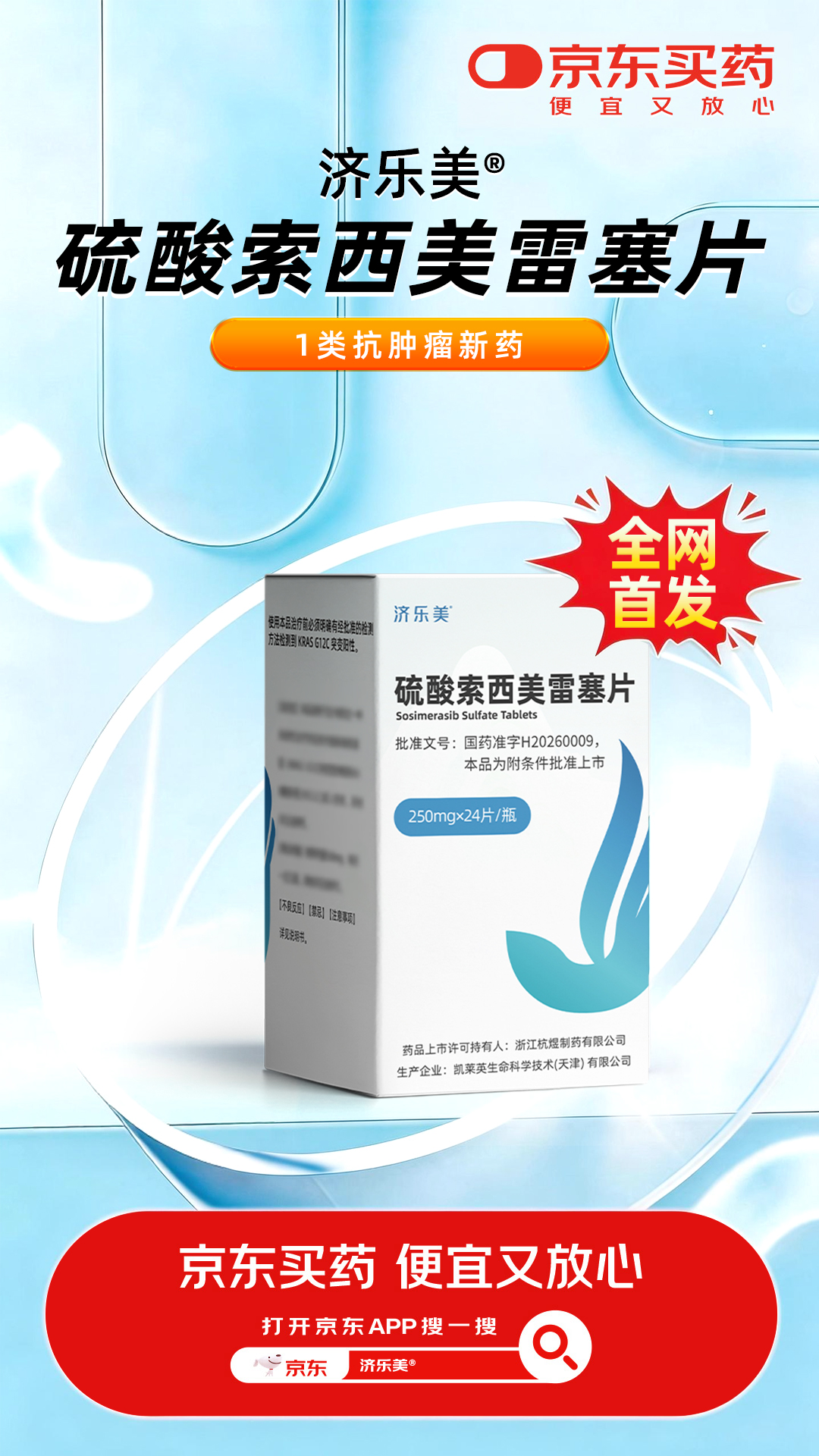 3月26日,上海济煜医药自主研发的1类抗肿瘤创新药济乐美®(硫酸索西美雷塞片),在京东健康全网首发。该产品是目前国内第四家获批上市的KRAS G12C抑制剂,专为KRAS G12C突变型晚期非小细胞肺癌患者打造,为国内晚期肺癌患者带来精准高效的治疗新选择。京东健康将持续发挥“新特药全网首发第一站”的能力优势,加速创新抗肿瘤药物触达患者,助力提升我国肿瘤疾病的规范治疗水平与患者生存质量。