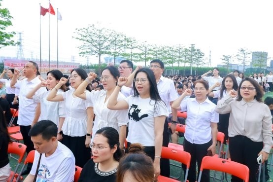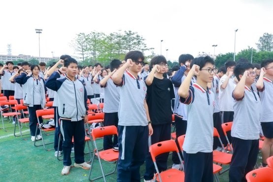 在一片欢欣的氛围里,朝晖高级中学正式颁发了首届“荣誉校董”和“家校共育特聘顾问”聘书;师生宣誓的声音响彻校园。全体师生举起右拳,立下立德树人、勤学笃行的誓言。他们目光灼灼,誓言掷地有声,他们的声音汇成了一股声浪,在操场上空久久回荡;在仪式最后,领导嘉宾与师生代表合影留念。快门按下,这一历史性时刻被永远定格,成为朝晖新征程上最浓墨重彩的开端。至此,广州市朝晖高级中学揭牌仪式圆满落成。